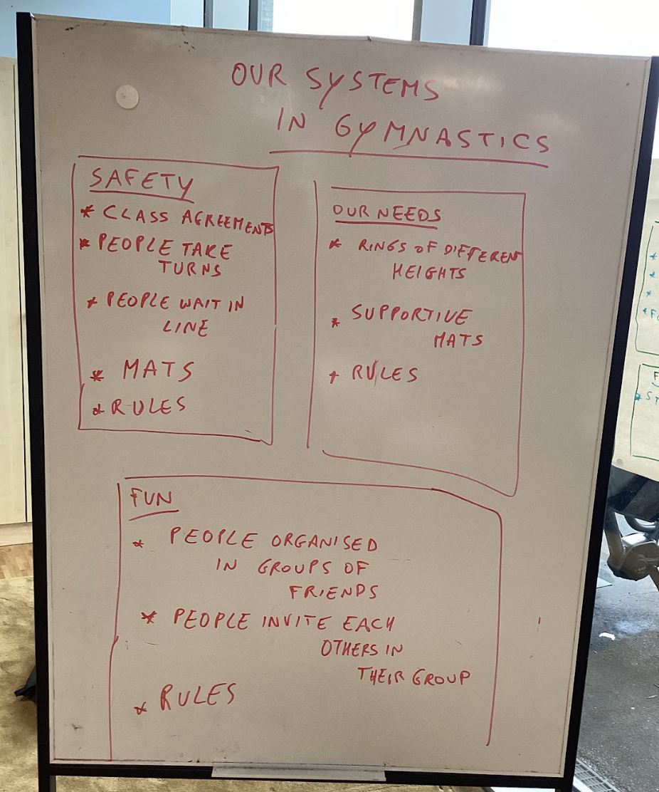 As a reflection on our learning at the end of the 6 weeks, we brainstormed with the students about what systems we had in place in gymnastics and how they met their needs, ensured they were safe and allowed them to have fun.